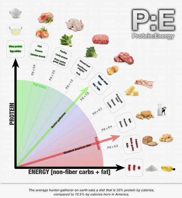 Developed by Ted Naiman, M.D., “P:E” stands for the ratio between protein and energy in individual foods and meals. Naiman classifieds “energy” as both carbs and fat – he groups them together for simplicity.