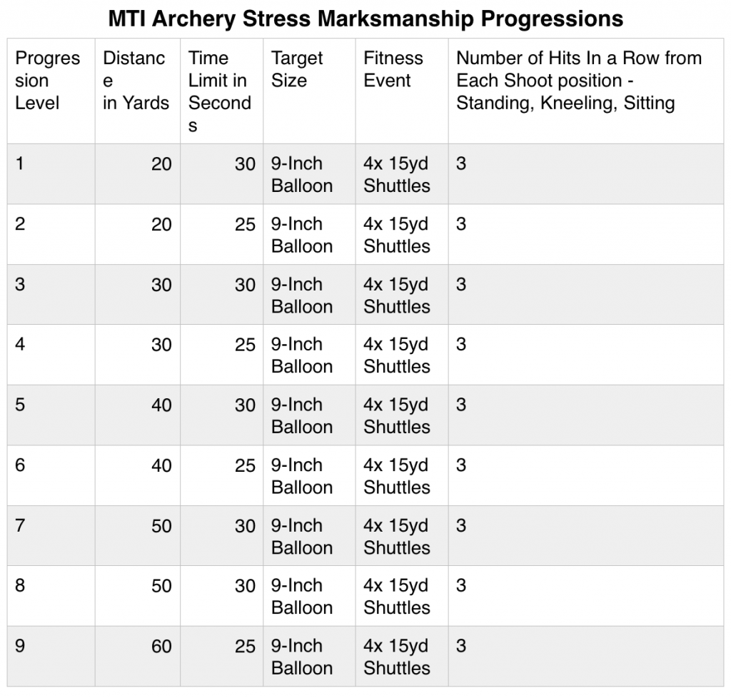 Below is my initial thoughts on progression moving forward. Note that the archer cannot move to the next progression level until he/she has hit 3 balloons in a row, with a 25 second time limit from all three shooting positions – standing/kneeling/sitting.