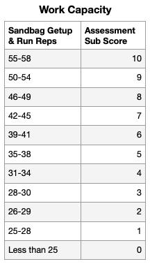 Protocol: Set two cones to 40 feet apart, and a countdown timer or stopwatch for 9 minutes. The athlete starts in the standing position with a sandbag on his/her shoulder at one end. At “go” the athlete lays down, does a sandbag getup, and then runs, with the sandbag to just past the far cone where he/she does another getup and runs back to start. Every length counts as 1 rep (so down/back = 2 reps). Athlete can switch shoulders as he/she sees fit. Record final reps (only full-lengths count).