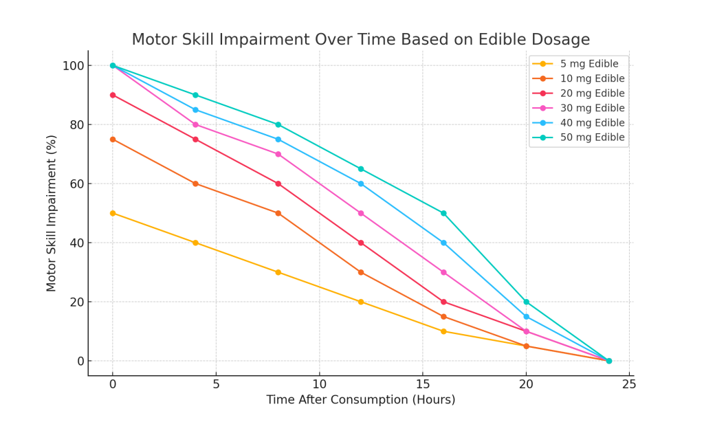 - Moderate impairment duration: A 10 mg edible will cause mild to moderate impairment, starting at ~75% impairment and gradually tapering off over 24 hours. The graph below is an approximation of motor skill impairment over time for varying dosages for a 185lbs male with 15% body fat percentage. Note that initial impairment and impairment decline rates can vary individually based on tolerance, marijuana quality, body composition, gender, etc.