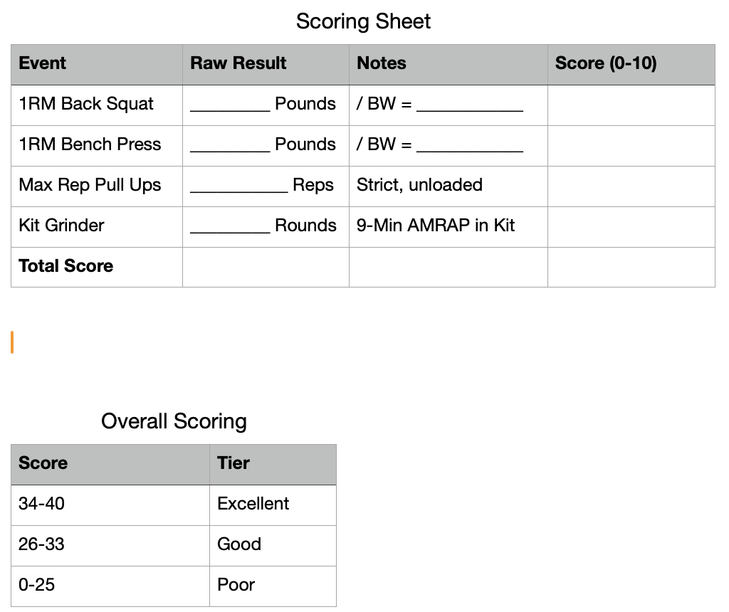 The assessment was developed specifically for part-time tactical teams with limited shared training time. It is concise, highly functional, and designed to reflect mission-direct fitness demands. A follow-on 4-week training plan was created, with athletes completing the assessment before, midway, and after the cycle to track progress.