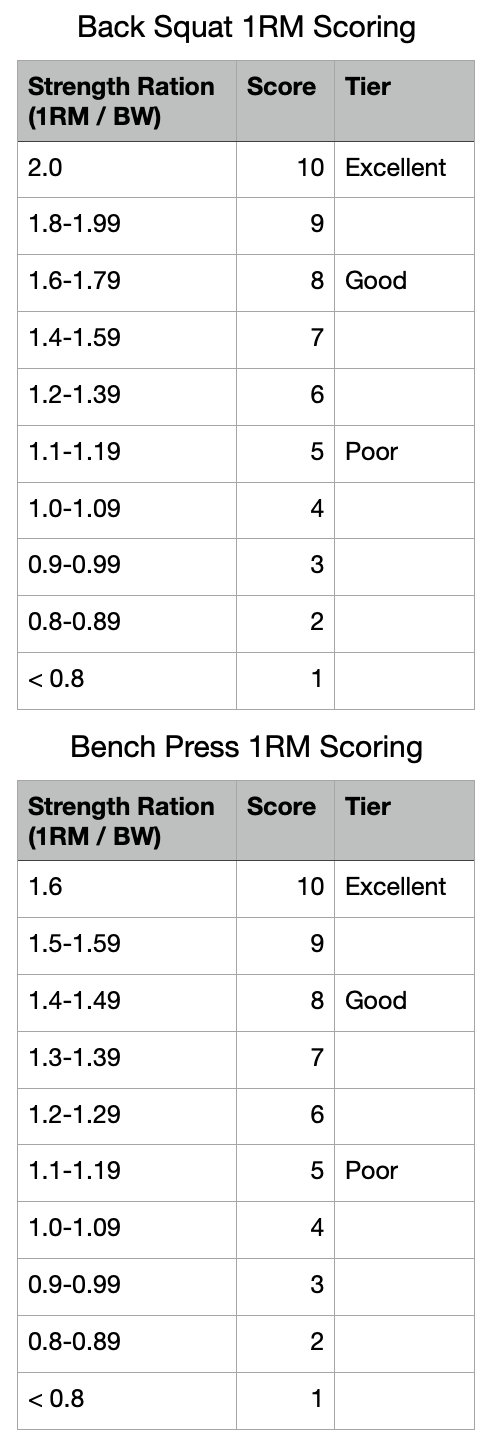 Each event is worth 10 points, for a maximum total score of 40 points. The strength events (Back Squat and Bench Press) are standardized using bodyweight—each athlete’s 1RM is divided by their bodyweight to calculate a strength ratio, which is then converted to a 10-point event score.