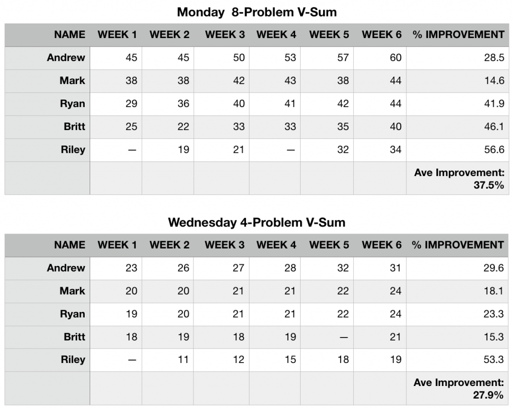I programmed the 40-minute, 4-problem V-Sum on Wednesdays, after two hard days of training prior in an effort to force the climbers to work on technical ability, knowing they would come into the Wednesday effort with pre-fatigued finger strength. My hope was that with tired fingers, the climbers would need to climb better technically, and not rely on strength/fitness, to steadily improve their Wednesday 4-problem V-Sum scores over the course of the cycle.