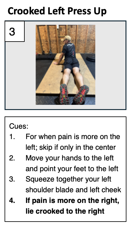 | Crooked Left Press Up (3) (left because my pain was on the left) | 2×20 | Felt better and I went down further towards my toes | Did at least 100, typically 300 per day |