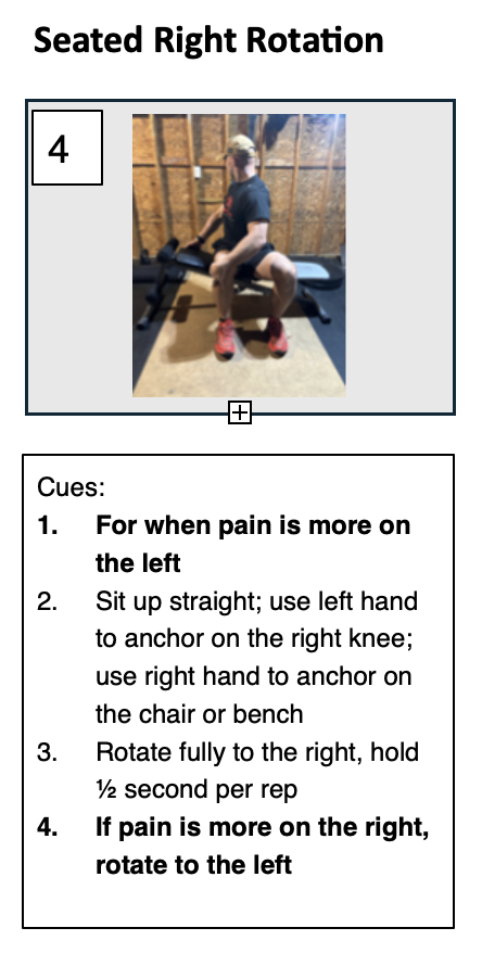 | Press Up (1) | 1-2×20 | Feels better, worse, or same | Do more, or do next exercise |