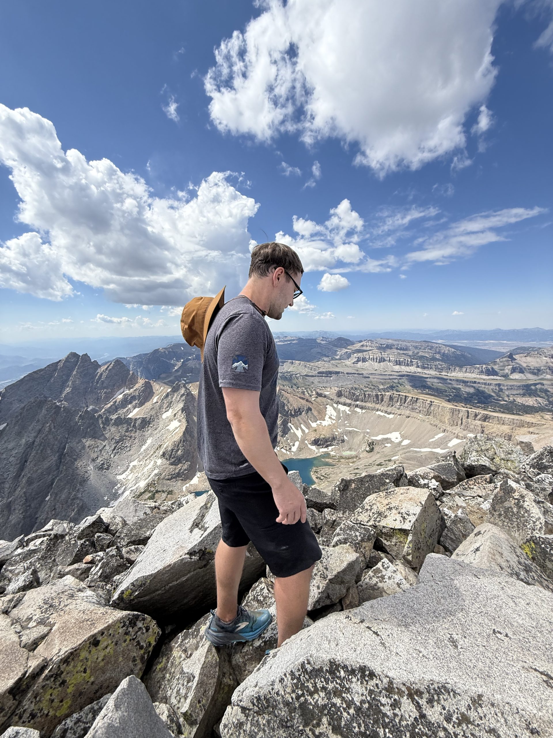 The climb up South Teton was more mellow than the Middle. The trail wasn’t always clear in the boulder field, but it was possible to pick out the line through the couloir, and the footing was far more stable. We saw around 14 people during the climb and two groups already on top. We summited South Teton at 11:56 a.m., 6 hours 56 minutes into the day, and then sat briefly before beginning the long descent.