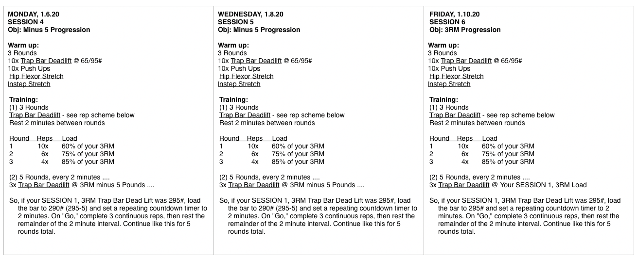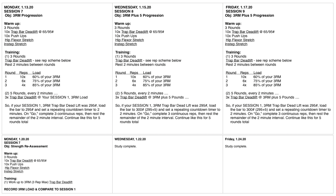 Lab Rat volunteers verified they had access to Trap Bars, weight, and could dedicate 3.5 weeks to this study. All completed the same programming and began their cycles with a Monday 3RM Trap Bar Deadlift Assessment, which was repeated after three weeks of 3-day/week training using the appropriate progression.