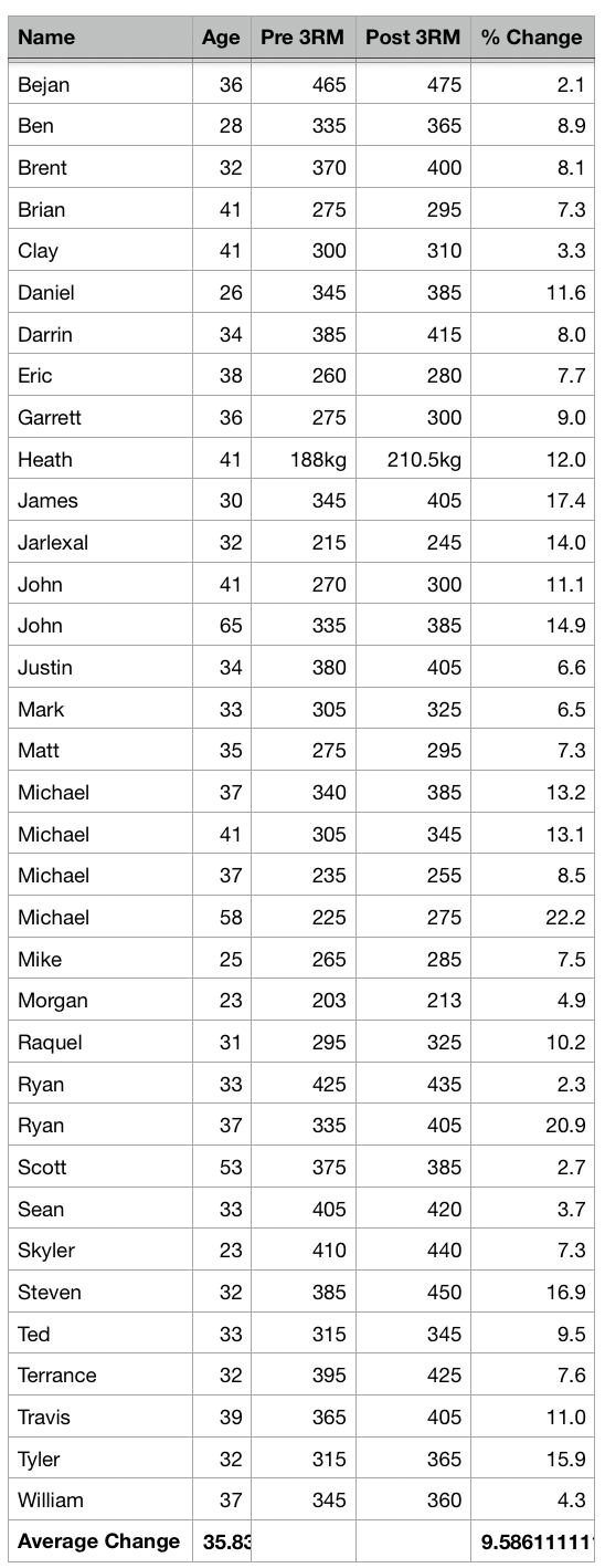 A total of 36 experienced training and weight lifting individuals with an average age of 35.8 completed the study. The average gain in 3RM Trap Bar Deadlift strength was 9.58 percent.
