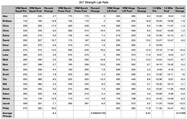 The significantly greater improvement in the 357 Strength lab rats’, 1.5 run assessment is surprising. The only difference between the two cycles was the 3-7 minute, primarily bodyweight, work capacity effort each Monday, Wednesday and Friday in the 357 Strength study.