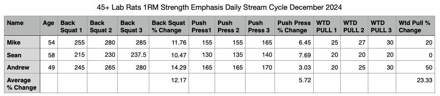 As well, loss of muscle mass and max effort strength is a significant issue for aging athletes. For these reasons I decided to program 1RM-Based strength programming for the December 2024 Daily 45+ programming stream. As part of this, I recuited remote lab rats to pre-run the cycle, to test it’s strength building effectness for older athletes, but also gage the older lab rats’ ability to complete and recover from the training, and their overall thoughts about it.