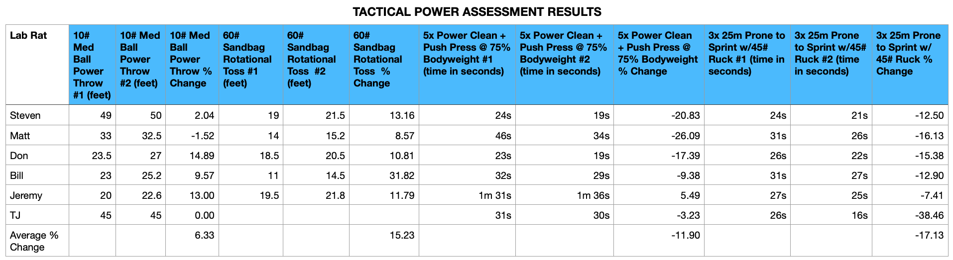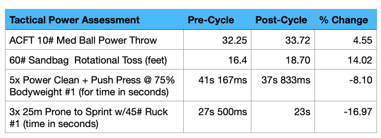 Four weeks of power-focused programming—incorporating max effort strength, speed strength, ballistic strength, and plyometric/sprint-focused tactical agility drills—improved Tactical Power across four assessments for six remote “lab rats.” Results are detailed below.