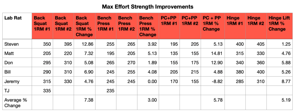 Max Effort Strength (e.g., 1RM Back Squat, Bench Press, etc.) also increased, though specific gains varied.