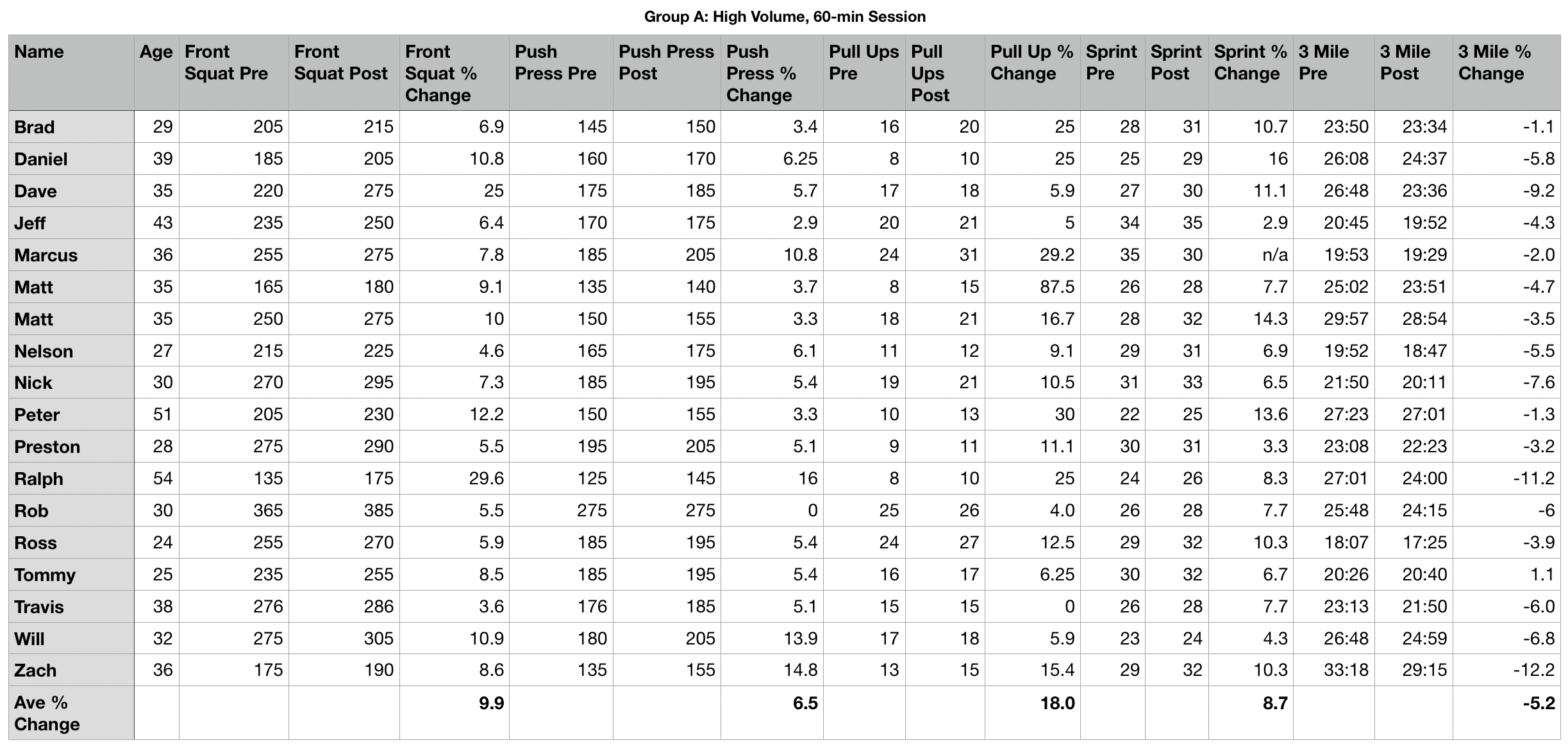- The high volume, long session (60-minute), Group A, trained 5 days/week and completed 10x total, 60-minute strength/work capacity training sessions including the initial assessment.