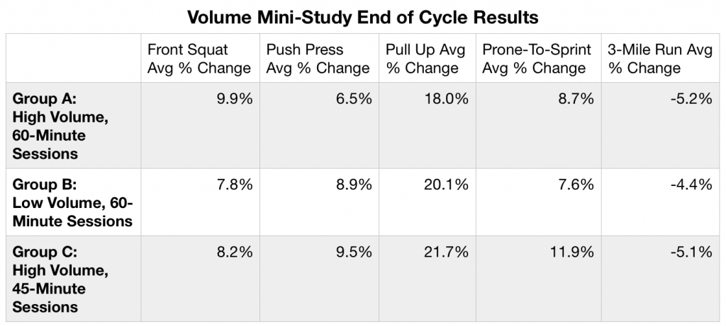 Each group completed the same progression methodologies for the strength, work capacity, and endurance work. This wasn’t a study comparing different progression methodologies, but rather testing differences in training volume using the same progressions.
