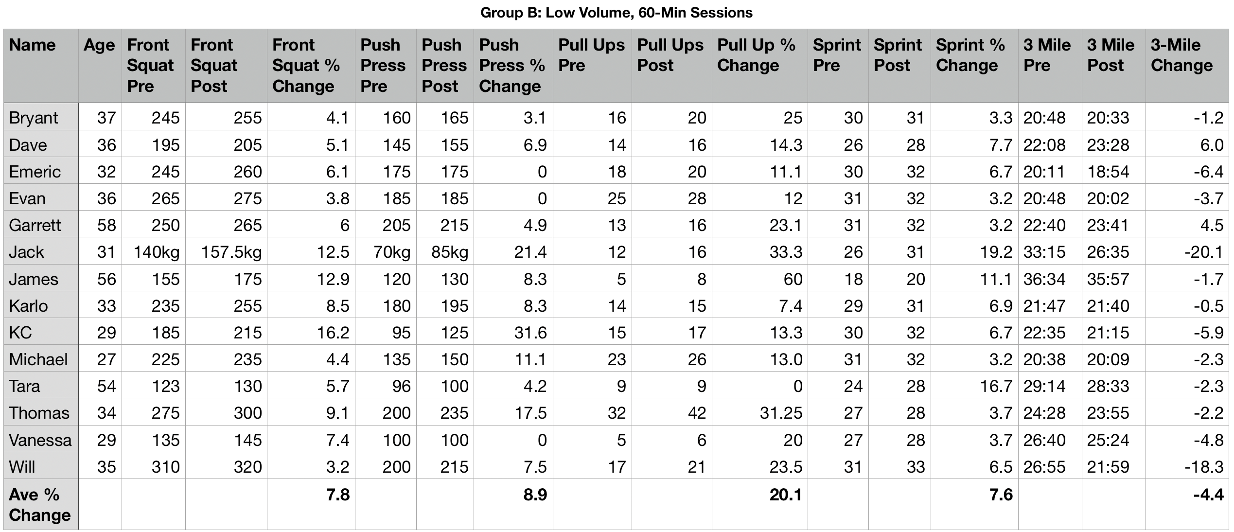 Group B: Low Volume, 60-Minute Sessions – These Lab Rats trained 4 days/week, 60 Minute Training Sessions. Overall, this group completed approximately 2/3 the total volume of Group A