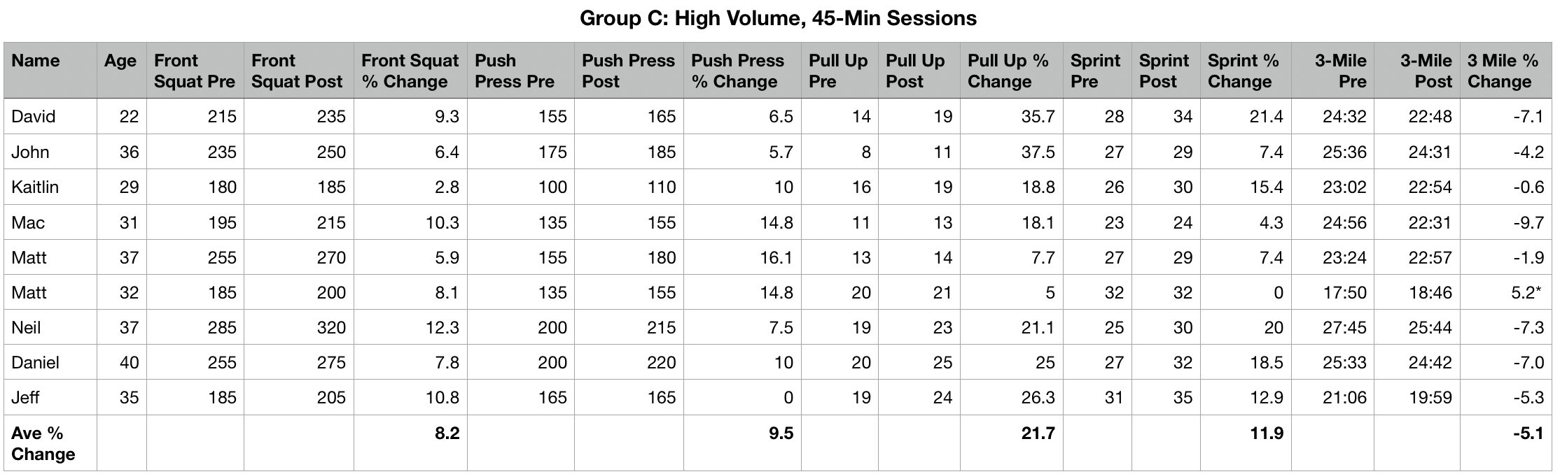Group C: High Volume, 45-Minute Sessions – These Lab Rats trained 5 days/week, 45-Minute Training Sessions. The warm up and set/rep schemes for the strength work were manipulated to shorten the session duration.
