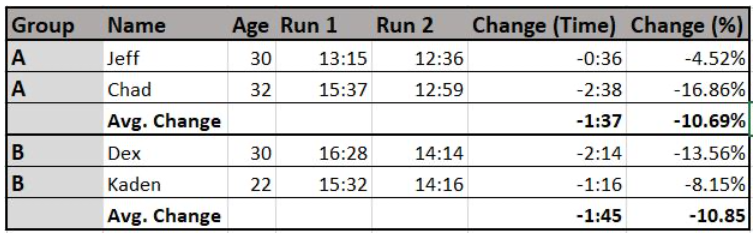 The averages in time- and percentage-improvements between groups were almost indistinguishable. When looking at individual improvements, the three people for whom this was the first dedicated and focused endurance work in a significant amount of time saw huge improvements, ranging from just over 8% to just under a whopping 17%.