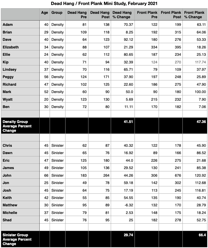 The average percent Dead Hang / Front Plank max effort for time improvement for both groups was impressive, but the results between Density vs Sinister progression were split.