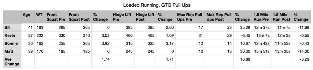 All four lab rats maintained or slightly improved their lower body strength as assessed using a 1RM Front Squat and Hinge Lift. In addition, their 1.5-mile unloaded run improved by an average of 8%. Strength was maintained despite no lifting during this cycle and unloaded running improved despite no unloaded running.