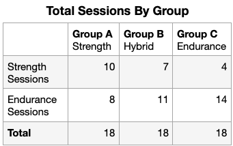 - Group B (Hybrid) trained strength 2 days/week and endurance 3 days/week.