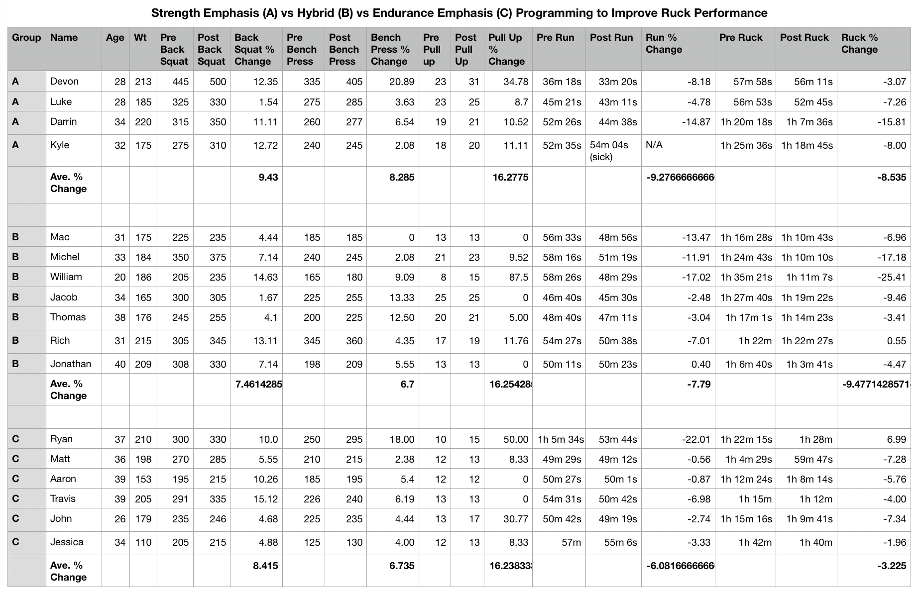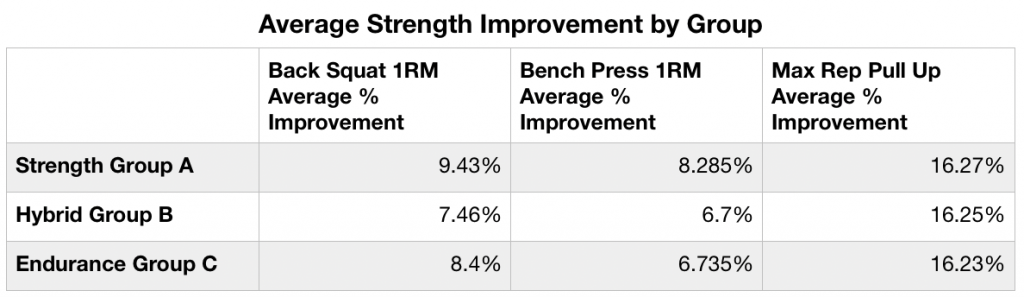 On the surface, you might assume that because the Strength (A) and Hybrid (B) groups trained more strength, they would have had more strength improvement and that this increase in strength would account for the greater improvement in rucking speed.