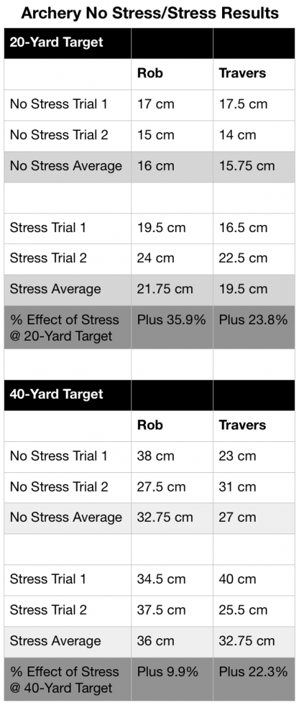 Overall, both subjects at both distances shot 23% less accurate 3-arrow groups during the stress trials than the no-stress trials.