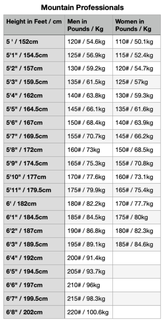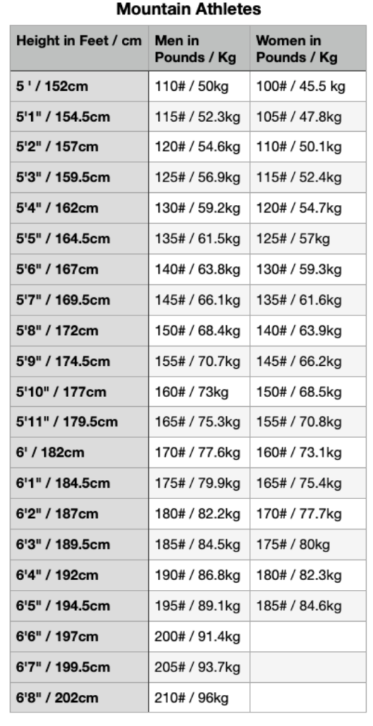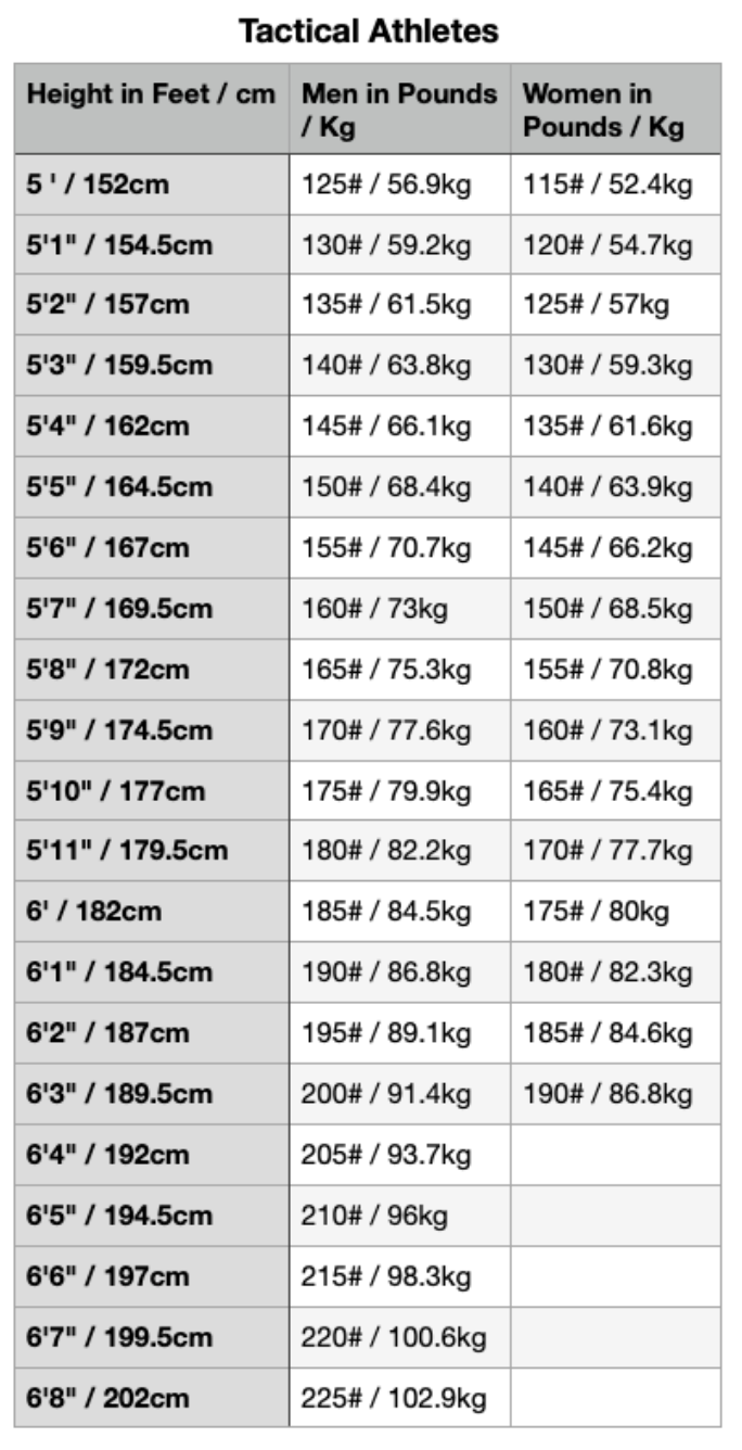 For each inch of height, ideal bodyweight increases by about five pounds. Tactical athletes tend to be five pounds heavier than mountain professionals, who are roughly ten pounds heavier than mountain athletes of the same height.