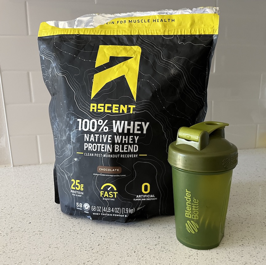 My current protein mix is called “Ascent 100% Whey,” which I purchased at Costco. Each serving contains 120 calories, 25 grams of protein, and just 4 grams of carbs. This brand stands out because it lacks artificial sweeteners, making it less sweet compared to other brands I’ve tried. I highly recommend it.