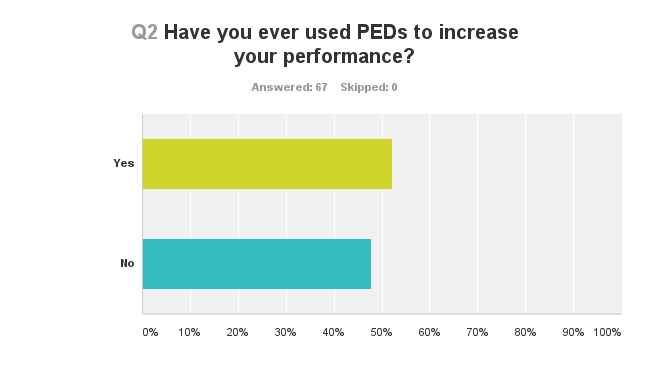In total, 67 athletes responded to the survey. Of those, it was a near 50/50 split for those who had used PEDs, and those who had not.
