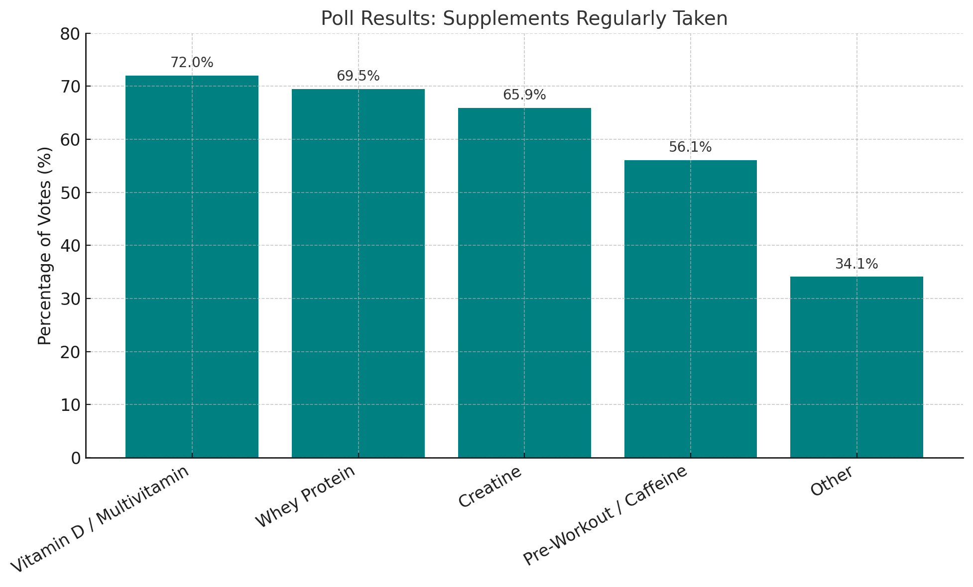 Most of you prioritize foundational supplements: 72% take Vitamin D or a multivitamin, followed closely by whey protein (69.5%) and creatine (65.9%). Pre-workout and caffeine are used by 56.1% of respondents. 34.1% listed “Other” supplements, including boron, magnesium, fish oil, citrulline malate, beta-alanine, and collagen. Thanks for sharing what fuels your training!