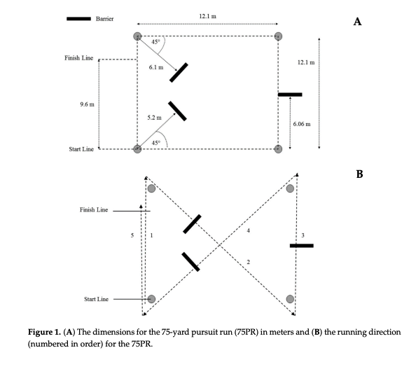 The 75-yard pursuit run simulated a law enforcement foot pursuit, assessing high-intensity running and agility.