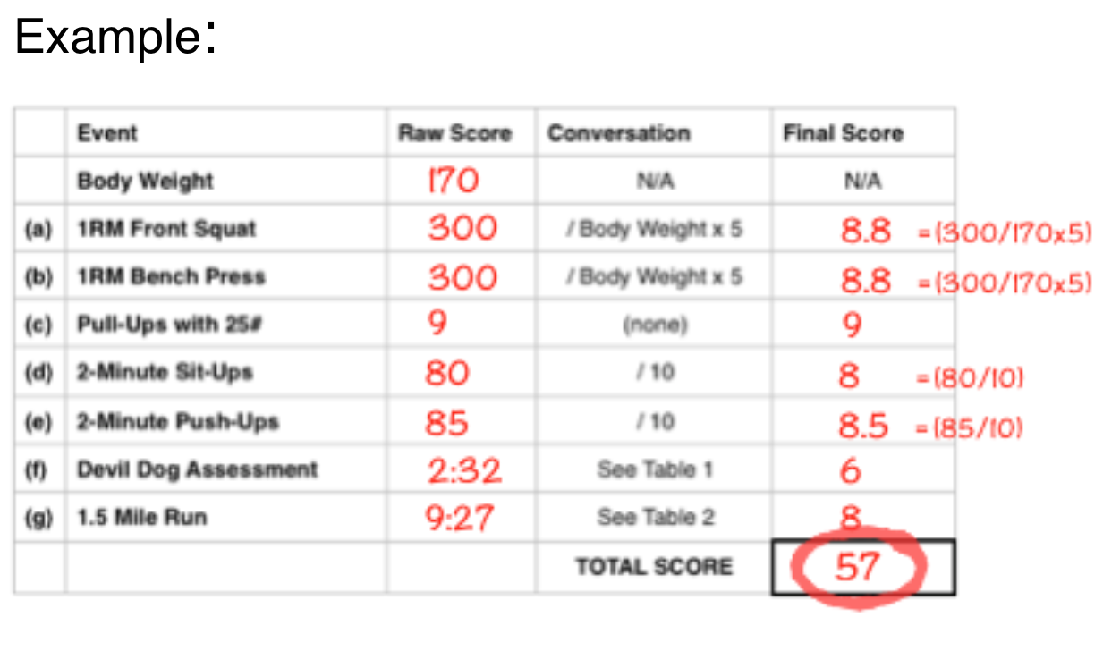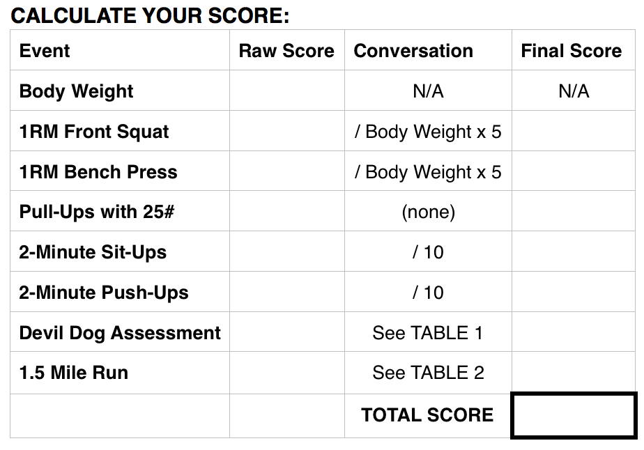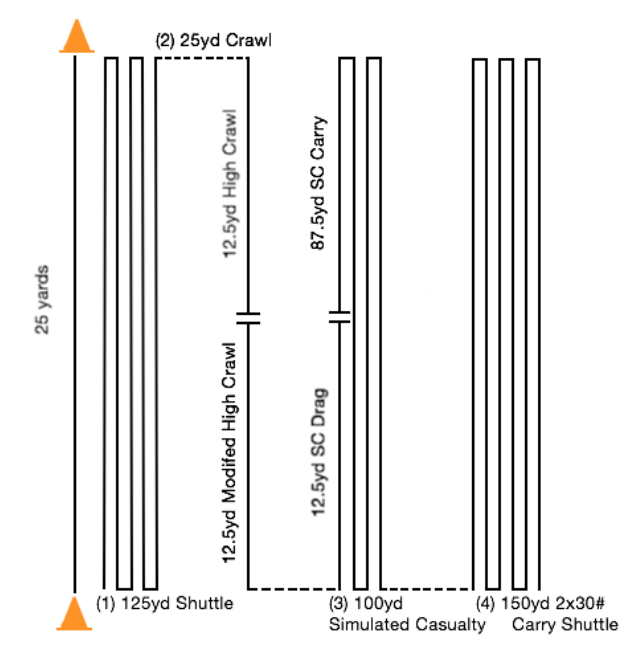 Watch our VIDEO. To complete the assessment all you will need is: 2x cones (to mark the 25 yard course), a partner (or dummy or 80# sandbag) and 2x 30# Ammo Cans or Dumbbells. The assessment will be done with a 25# weight vest.