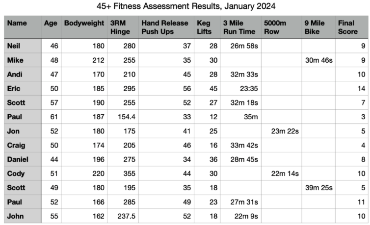 In January, 2024, 13 veteran MTI Athletes completed the Age 45+ Fitness Assessment. Their results are below:Â