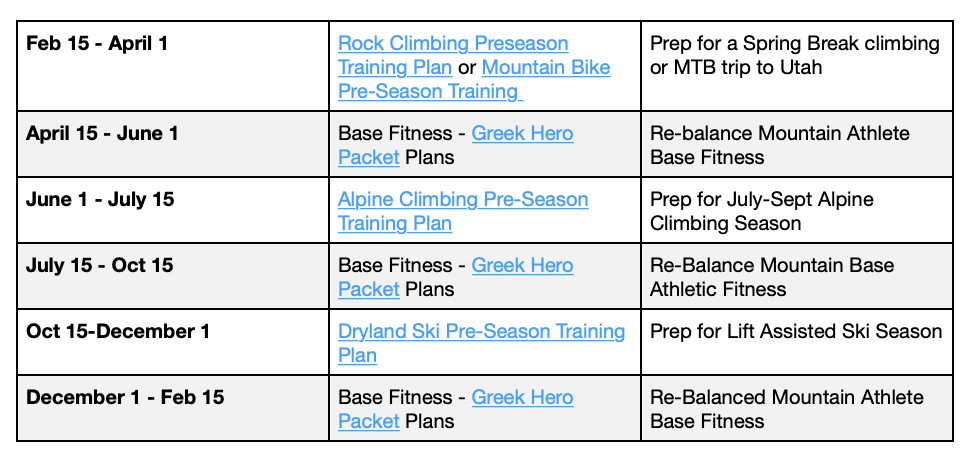 Somewhere on your website, I remember seeing a training calendar that showed example plans throughout a year (i.e ski prep training, then a strength training plan, then something to get ready for running season, etc.). Do you know where I can find that resource?
