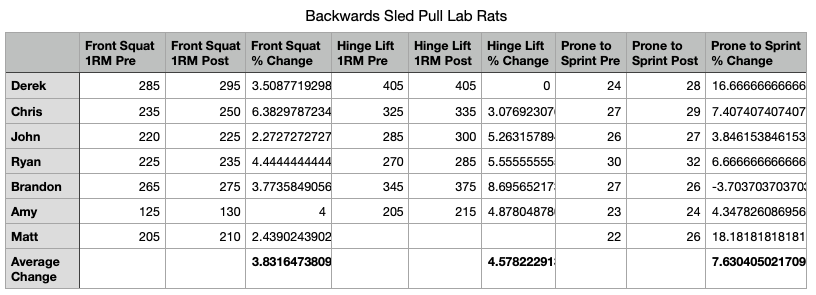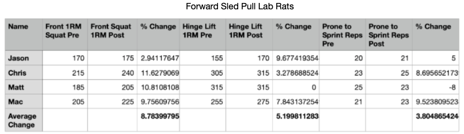 As seen above, both the forward and backward pull lat rats saw improvement in all three metrics. The most significant difference in improvement occurred for the pre and post cycle Front Squat 1RM. Although the forward pull lab rats achieved an 8.7% Front Squat 1RM improvement vs. 3.8% improvement for the backwards pull lab rats, the relatively low number of lab rats for both Mini Studies means we’re not confident stating forward sled pulls do a better job at increasing front squat strength.
