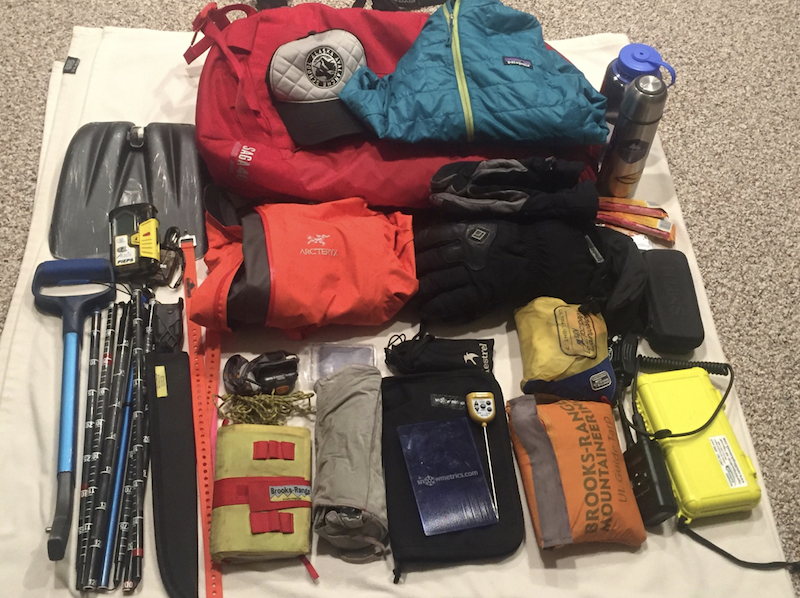 The heavier pack will include avalanche rescue gear, repair kit, snow study kit, satellite phone, improvised rescue sled, improvised shelter, first aid kit, extra insulated layers, Gortex layers, warm hat, nutrition; including hot drink in a thermos and food, 1 liter of water in a Nalgene, fuel and stove.