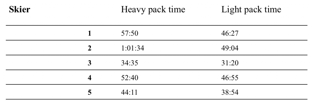 We conducted a mini study to identify whether load carriage has an effect on uphill skinning speed. Athletes were asked to ski up the same slope 2 times, once with a heavy but safe pack (25 lbs) and once with a light and fast pack (10 lbs). We determined athletes that participated in this study were on average 14.8% slower with the heavy but safe pack.