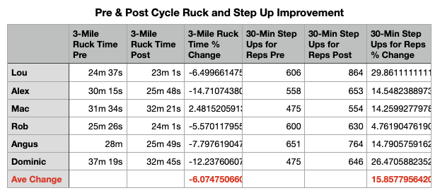 Post cycle, the lab rats averaged a 6% decrease in 3-Mile ruck time, but a 15.9% increase in step ups for the 30-minute assessment.
