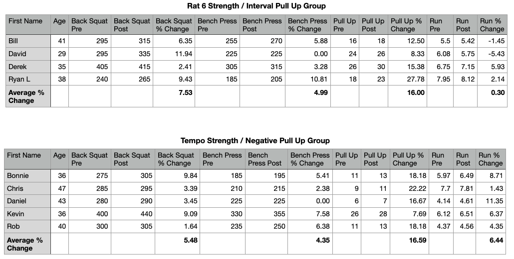 Twelve remote, paid, experienced MTI lab rats were randomly chosen and placed into a Rat 6 / Interval Pull Up and Tempo Strength / Negative Pull Up groups. Both groups completed the same aerobic base training during this 3-week cycle. Here was the weekly schedule: