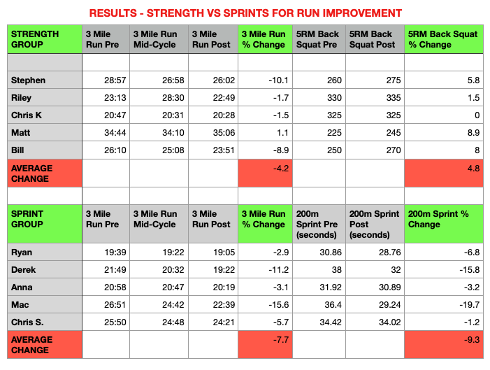 For this study, I wanted to compare resistance strength training vs short sprint training (with full recovery) for 3-mile run improvement.