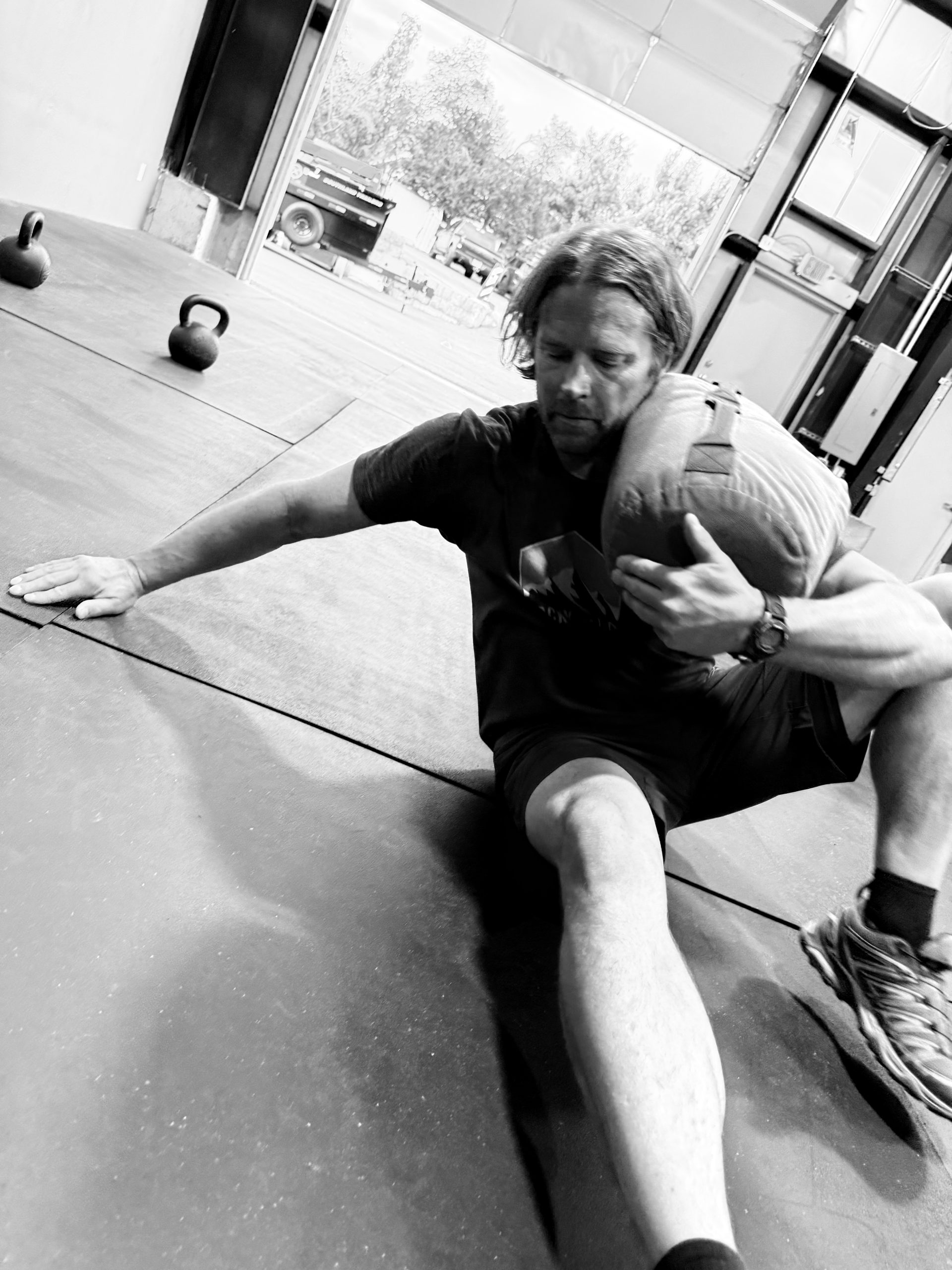 ● Sandbag Sit-Ups (90 seconds, 60–80 lbs based on prior loading)