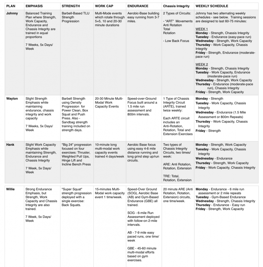 Each of the other 3 plans in this packet has a slight emphasis in one of the above-mentioned fitness attributes. For example, Waylon has a slight work capacity emphasis.