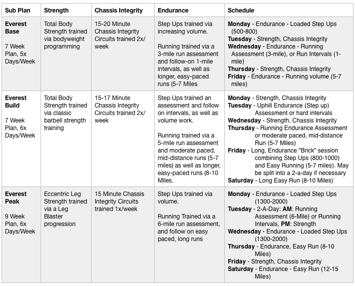 The 23-Week Everest Training Plan consists of 3-Sub Plans. Below is the entire first week of training from each Sub-Plan.