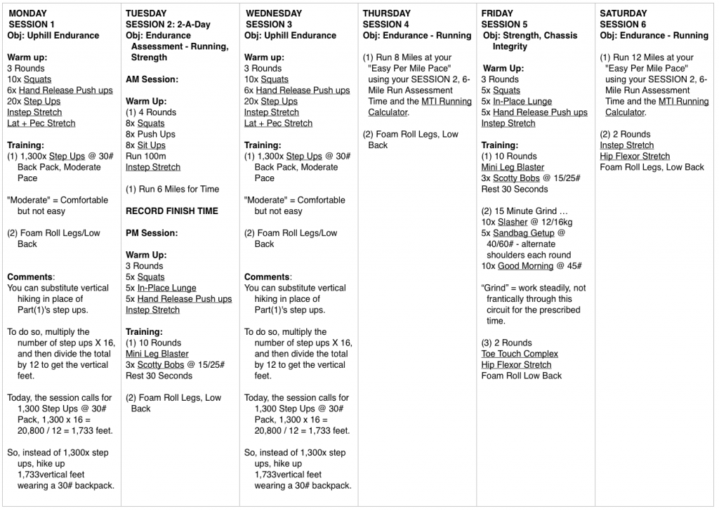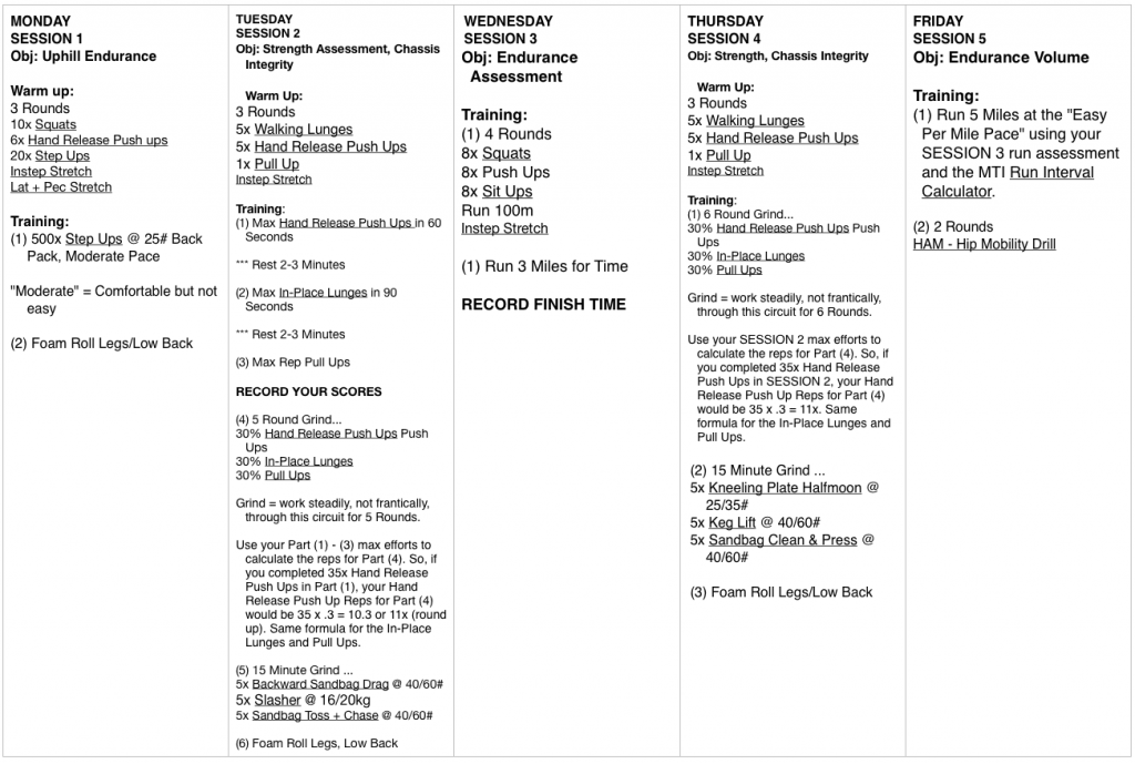 Before beginning any exercise program, consult with your physician to ensure that you are in proper health. Physical training contains inherent risks including, but not limited to, muscle strains, tears, physical and bodily injury up to and including death. This training program is not meant to provide medical advice; you should obtain medical advice from your private health care practitioner. If you are unable to assume these risks then you should not engage in this training program. No liability is assumed by Mountain Tactical Institute, Inc, its owners or employees, and you train at your own risk. Mountain Tactical Institute makes no warranty, express or implied, of any kind in connection with this training program.