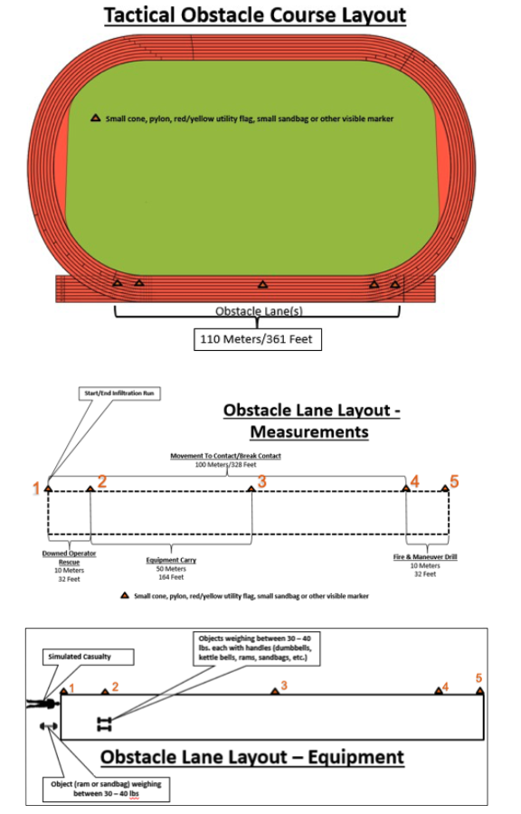 - Cones or Markers for the 150m Shuttle Course, 10m Prone to Sprint Course and Tactical Obstacle Course Markers