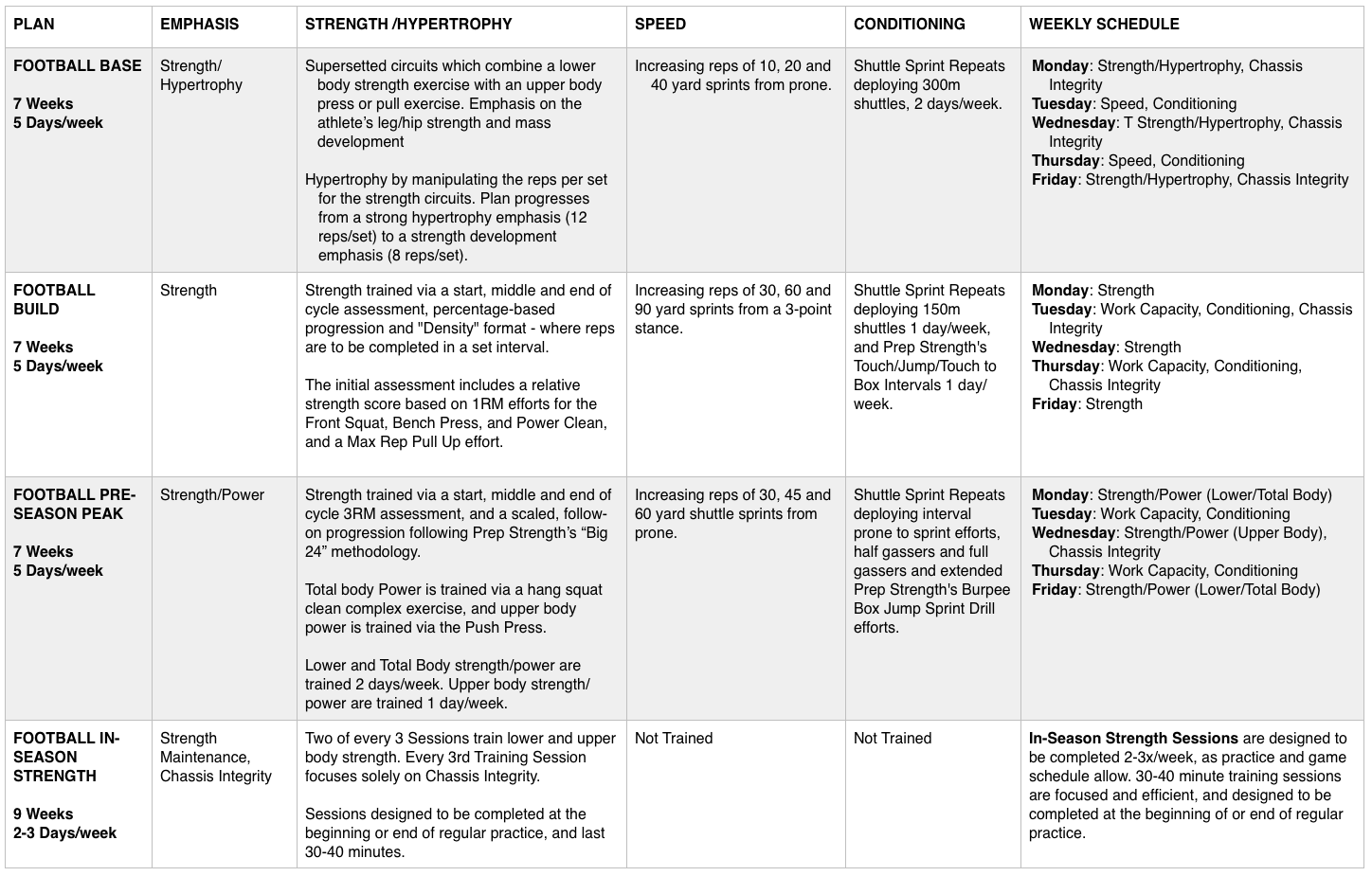 The Football Training Packet is composed of 4 training plans and 21 weeks of pre-season training, which are sport-specifically designed to prepare male, prep-aged football players for the fitness demands of the football season.