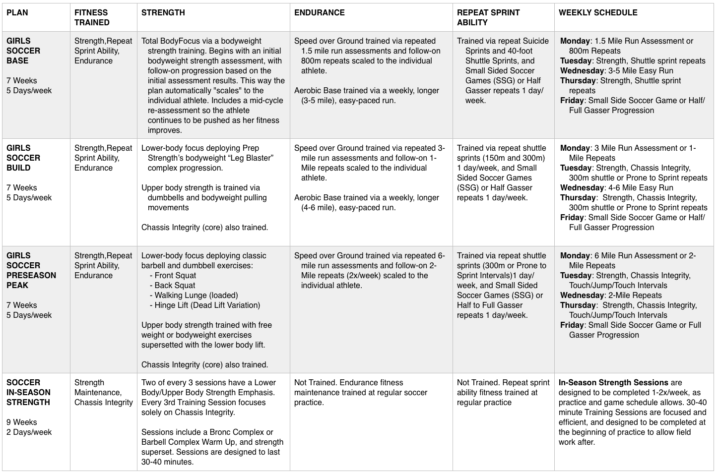 The Girls Soccer Training Packet is composed of 4 training plans and 21 weeks of pre-season training, which are sport-specifically designed to prepare female, prep-aged soccer plays for the fitness demands of the soccer season.