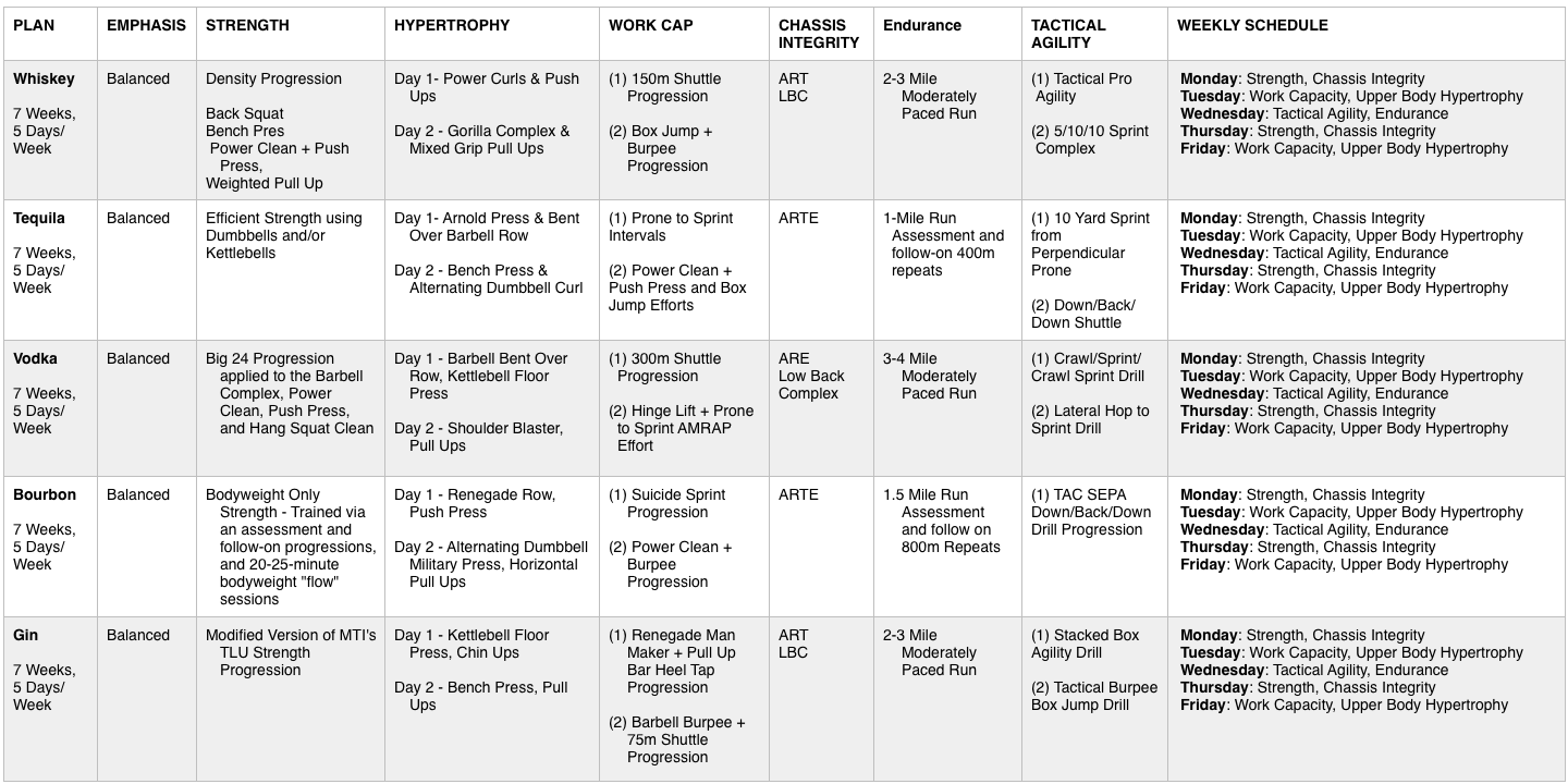 - Each plan has a “balanced” training approach, where strength, work capacity, endurance, upper body hypertrophy, and chassis integrity are trained concurrently.