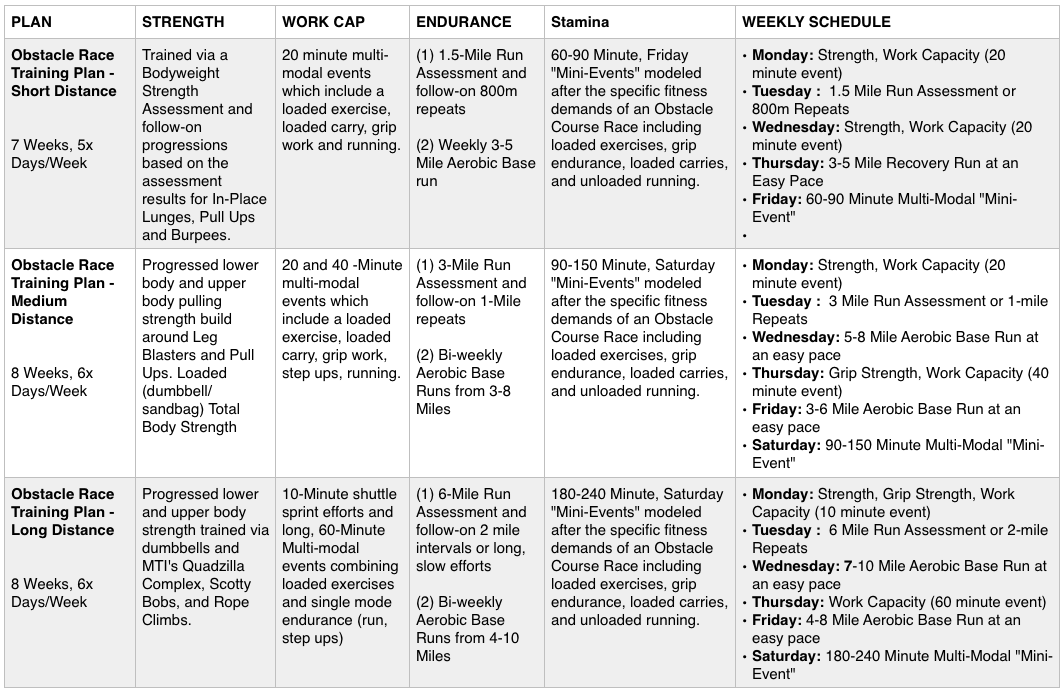 Each of the plans in this packet were built from the ground up to progressively prepare you for your respective Obstacle Race. Each plan is designed to be completed the 7 (Short) or 8 (Medium, Long, Ultra) weeks directly before your race.