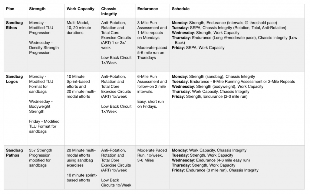This packet includes three plans to create a robust and challenging sandbag training program and deploys the sandbag as the primary piece of training equipment. Sandbag Ethos, Logos, and Pathos are a trilogy of plans that include exercises like the sandbag clean, sandbag getup, and more, and can be completed in a row or individually. All plans deploy our most recent fluid periodization and are intense, 6-7 week, 5 days/week training plans, designed for fit athletes.